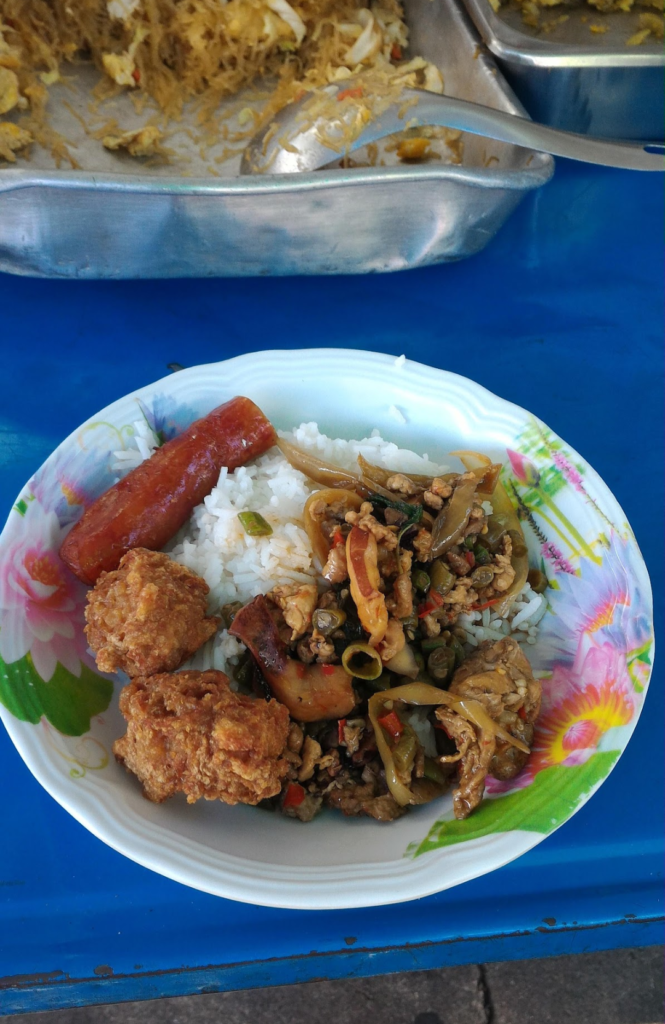 僕のオススメは朝ごはんのお粥の屋台、おかずを選んでご飯にのせてもらう屋台、オプションの目玉焼きものせたいところです。タイ風パンケーキも甘くて美味いよ。